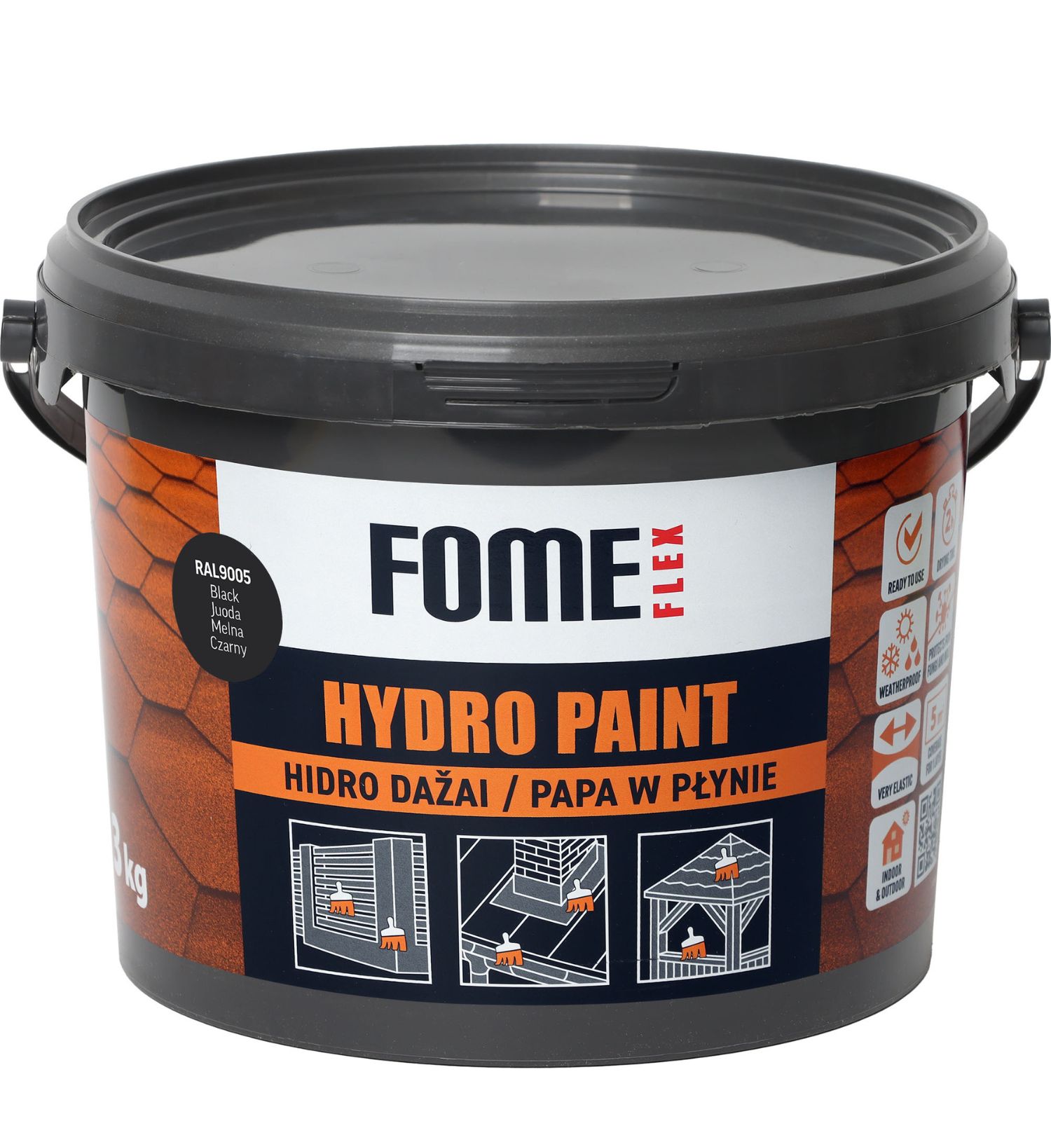 Fast drying, one-component, multi-purpose acrylic liquid paint and sealant, black RAL9005, 3 kg. It is ready-to-use and highly flexible coating used to protect, seal and decorate surfaces such as concrete, trapezoidal and galvanized sheet metal, bitumen shingles, roofing felt, metal, ceramic and cement roof tiles, plaster, and wood.
